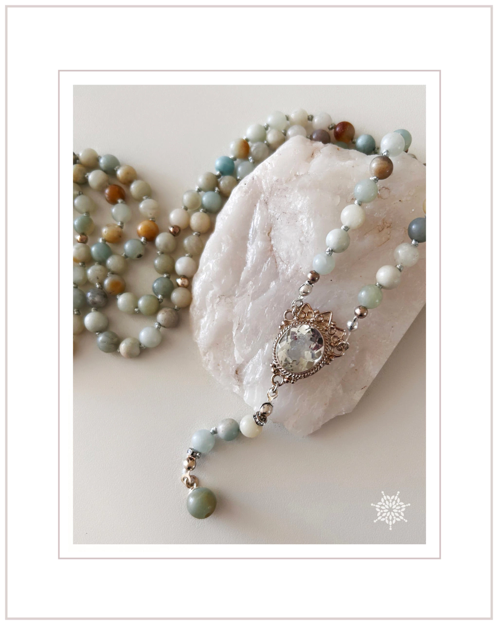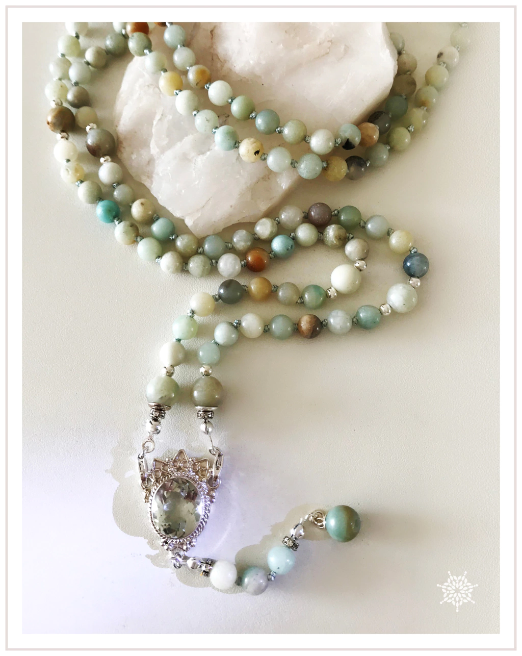 MAXI COLAR PRASIOLITA & AMAZONITA ANDINA – Cordão de 108 esferas Amazonita Andina 6 mm, média de 85 cm, acabamento em nós com fio especial, pendant em Prasiolita facetada 7 cts. Galeria e acabamentos em Prata 950.